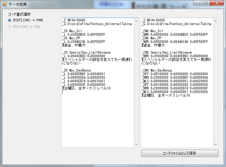 最低限のコード実行機能とサーチ機能、表示のみだがメモリエディタ、CWCのコード書式を変換する機能を付けたので、PMEtanForPSPに同梱することにした。